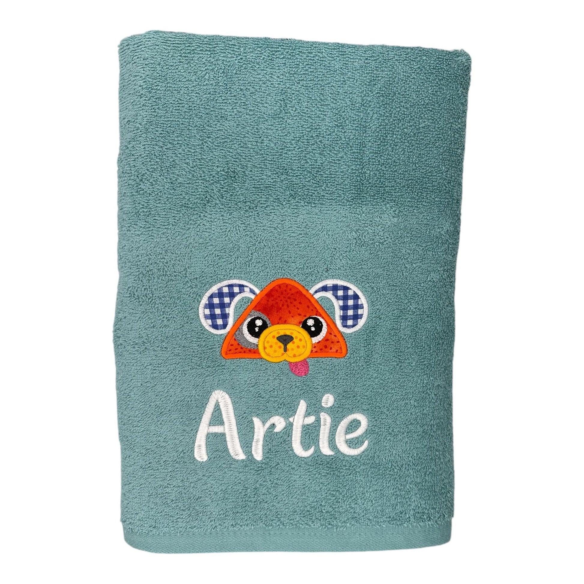 Embroidered kids bath towel, personalised with name and design of your choice. (Contact me with any special requests.)